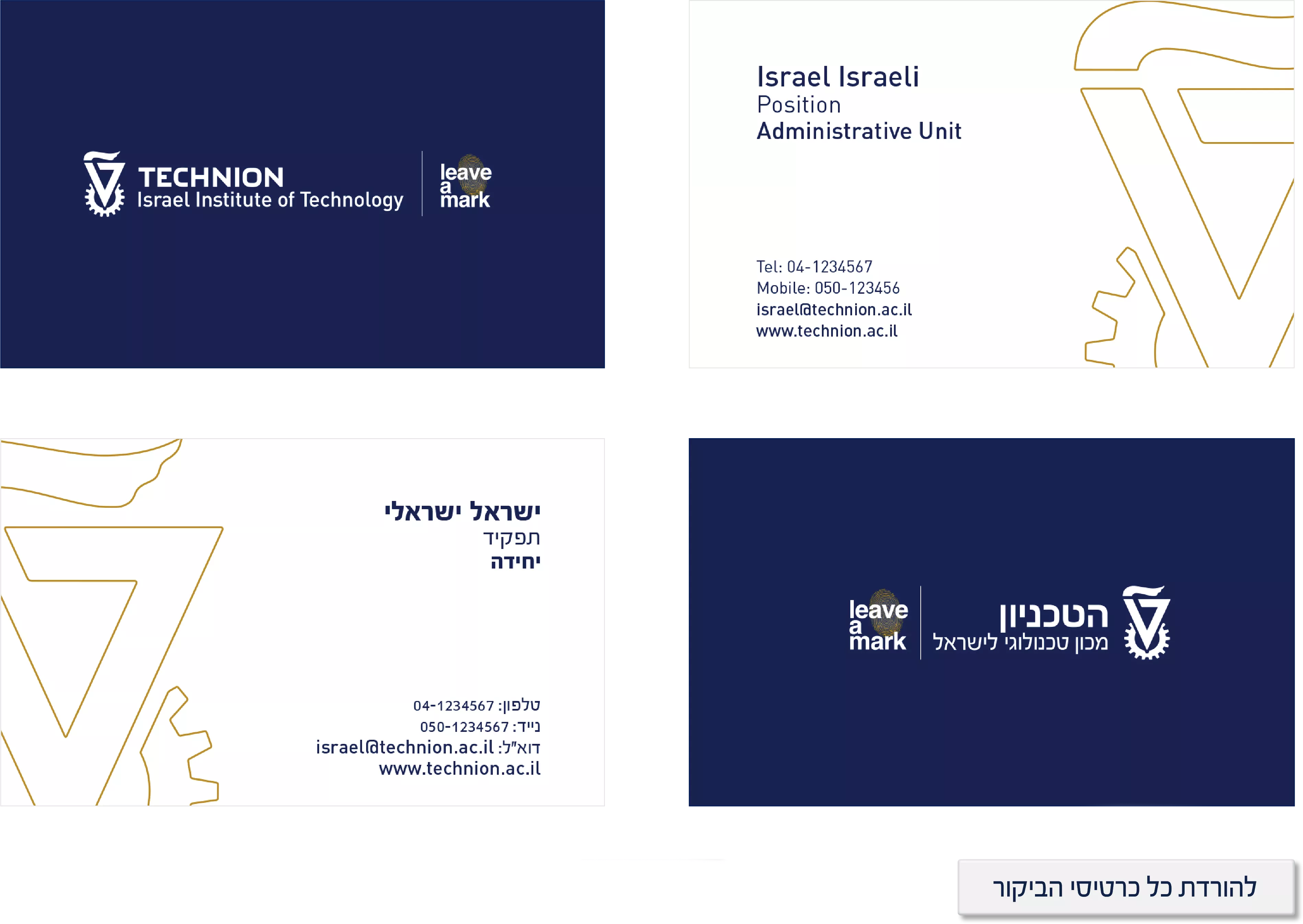 תבנית מעוצבת של כרטיסי ביקור לפי המיתוג הרשמי של הטכניון.